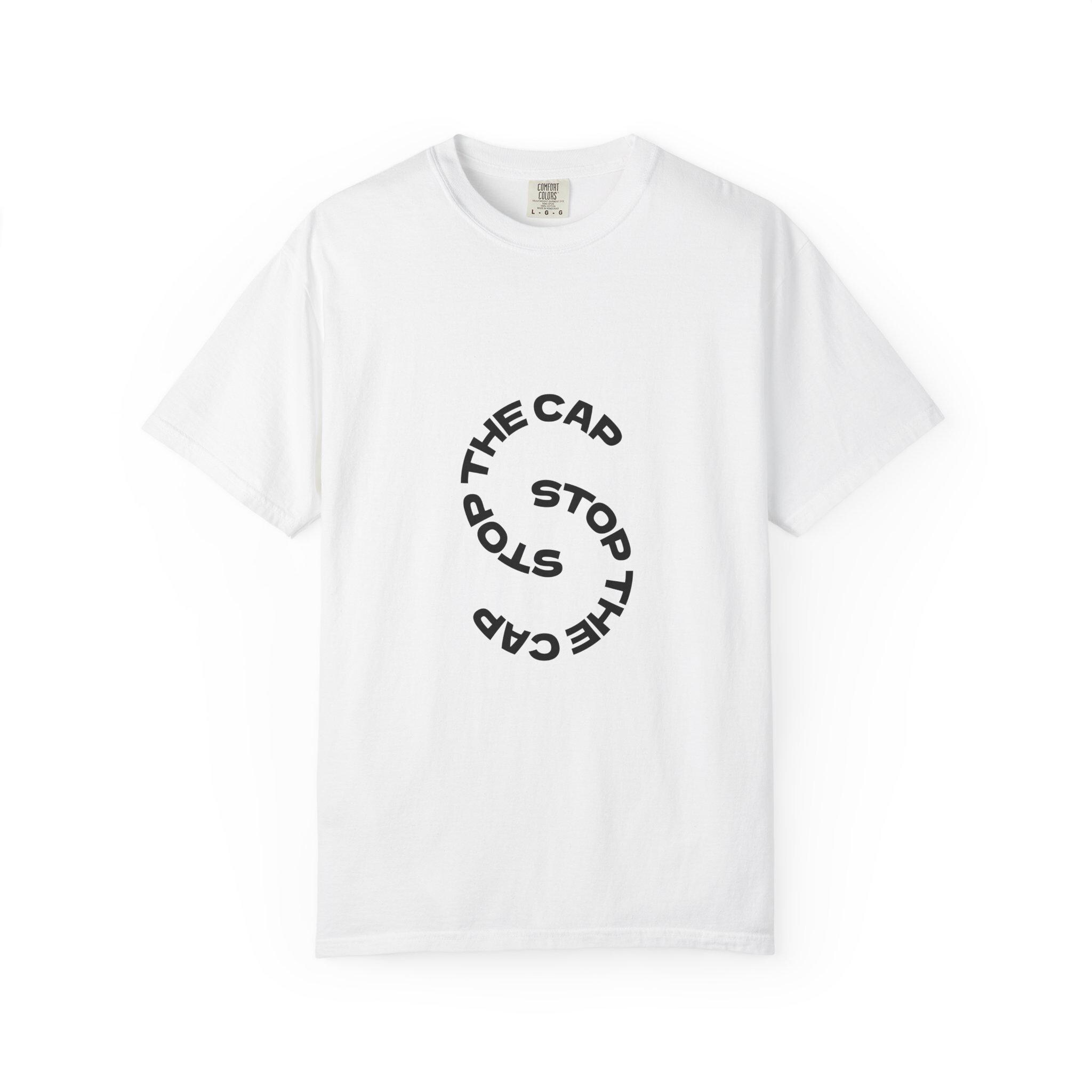 A stop the cap phrased t-shirt that exudes a casual and trendy vibe, perfect for everyday wear or as a statement piece. Ideal for individuals who appreciate humor and current trends. Relevant for casual outings, social gatherings, or as a fun gift for friends and family on birthdays or special occasions.