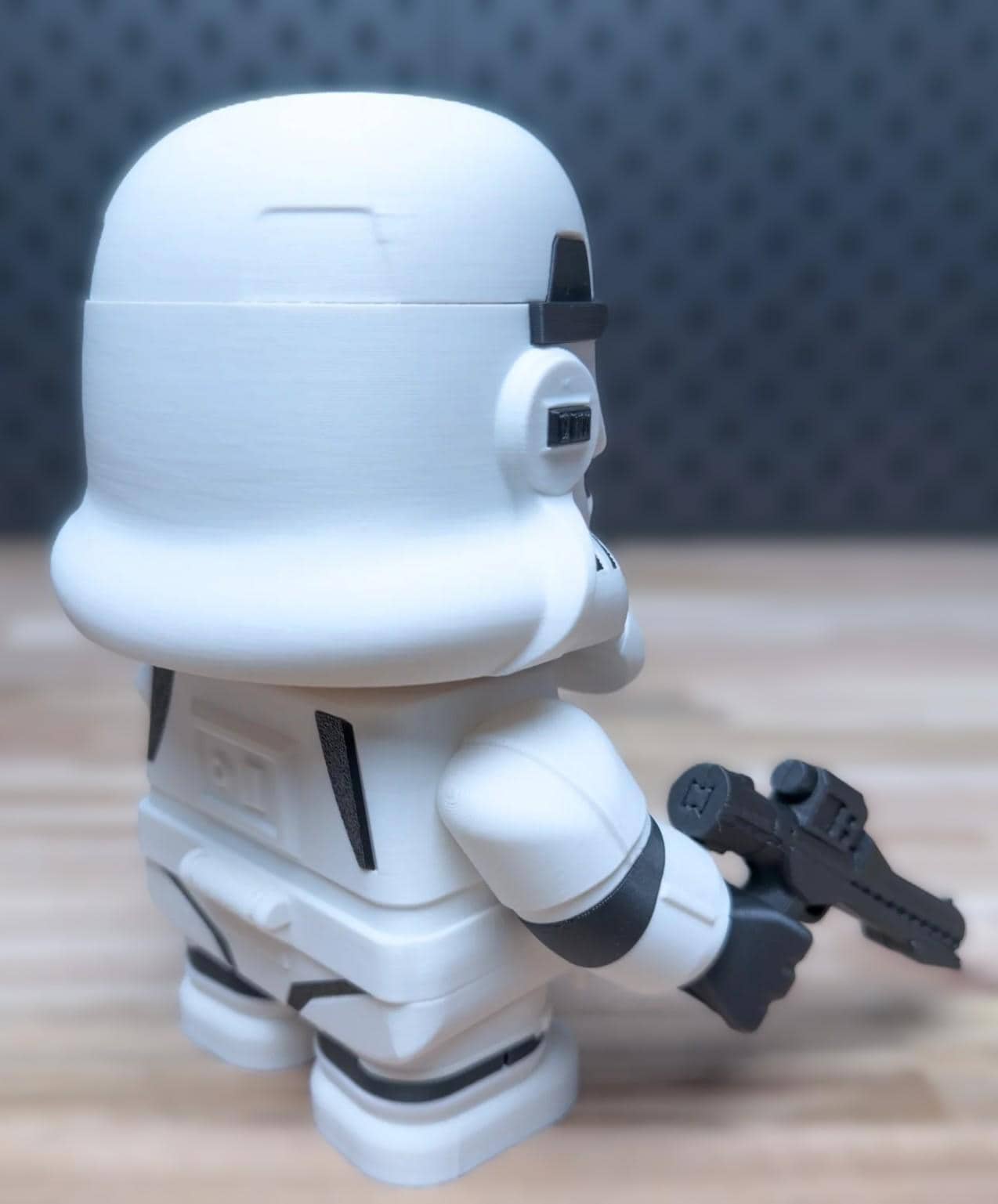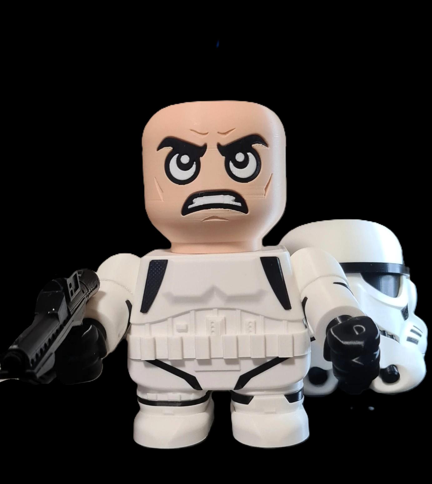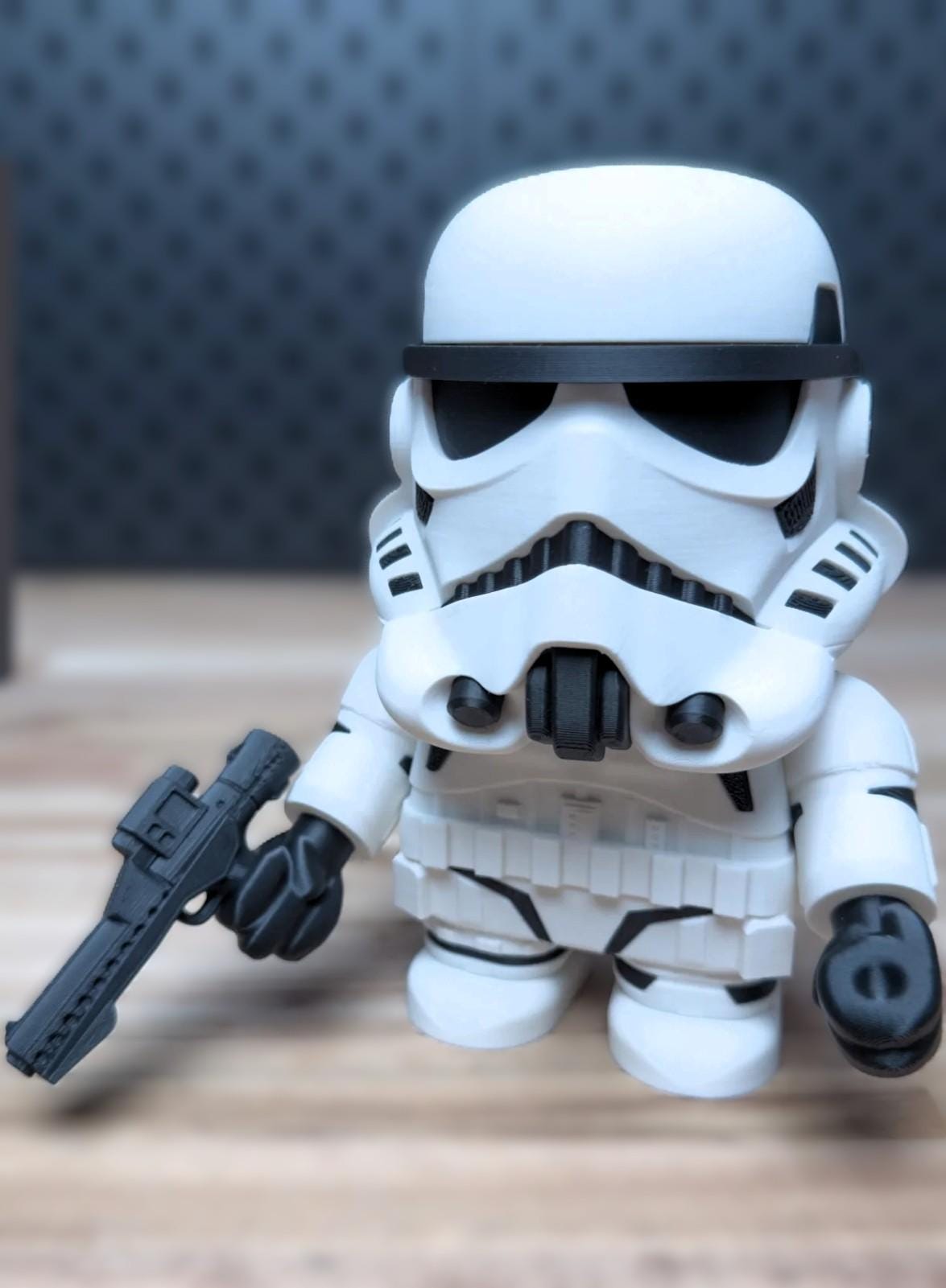 3D printed Storm trooper Figure with weapon. The head swivels from side to side, the helmet is able to be taken off, and the arms/hands move as well, in order to be played with or posed for display.
