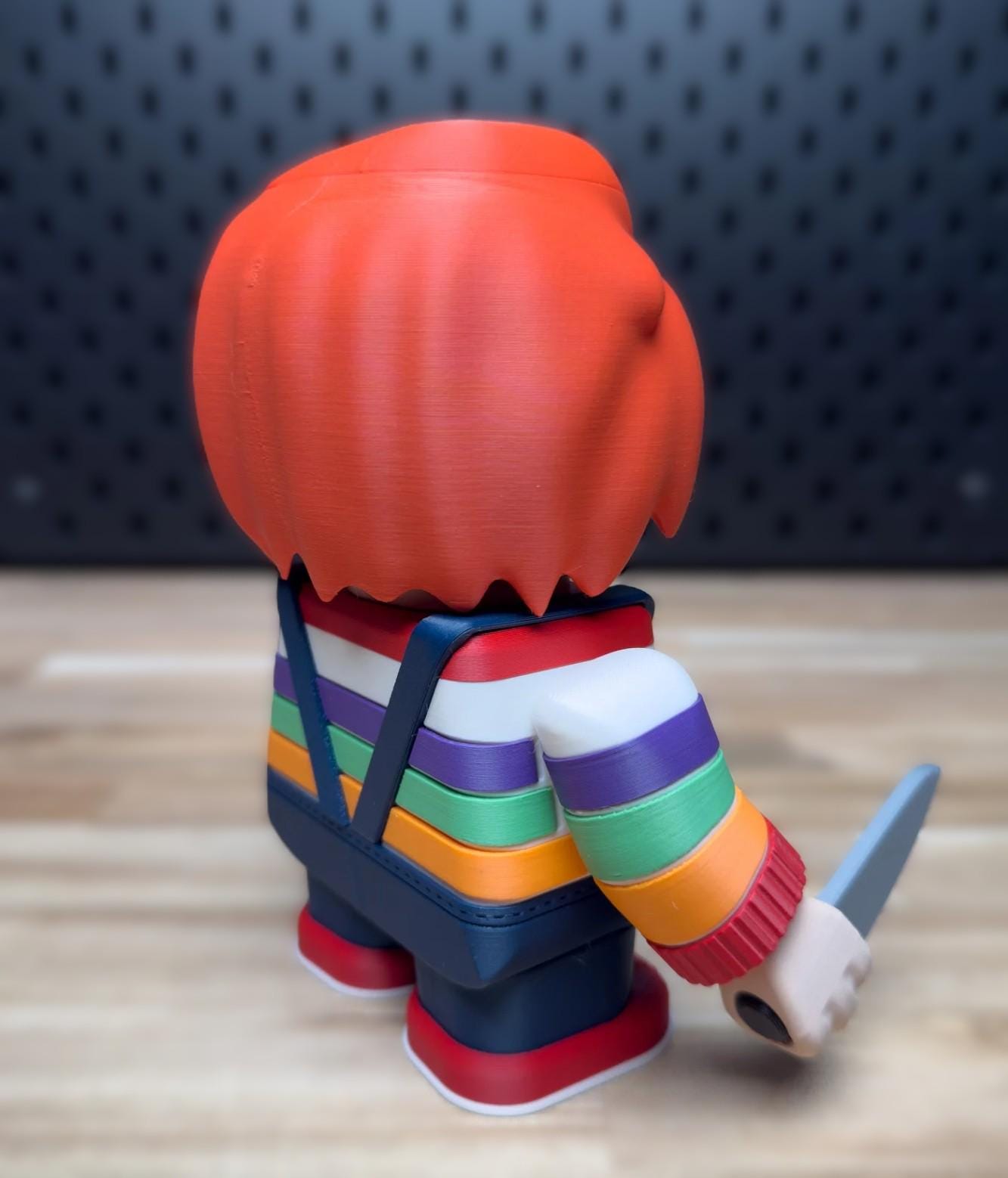 3D printed CHUCKY doll. The head swivels from side to side and the arms/hands move as well, in order to be played with or posed for display. His knife can be removed, as it slots into his hand.