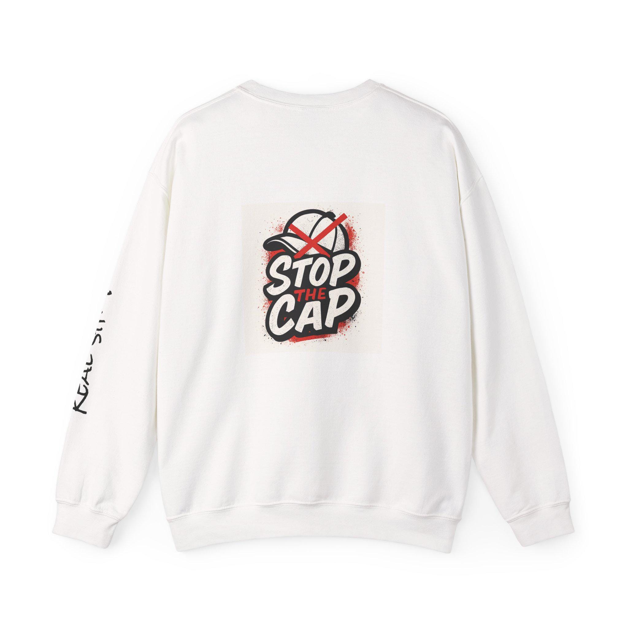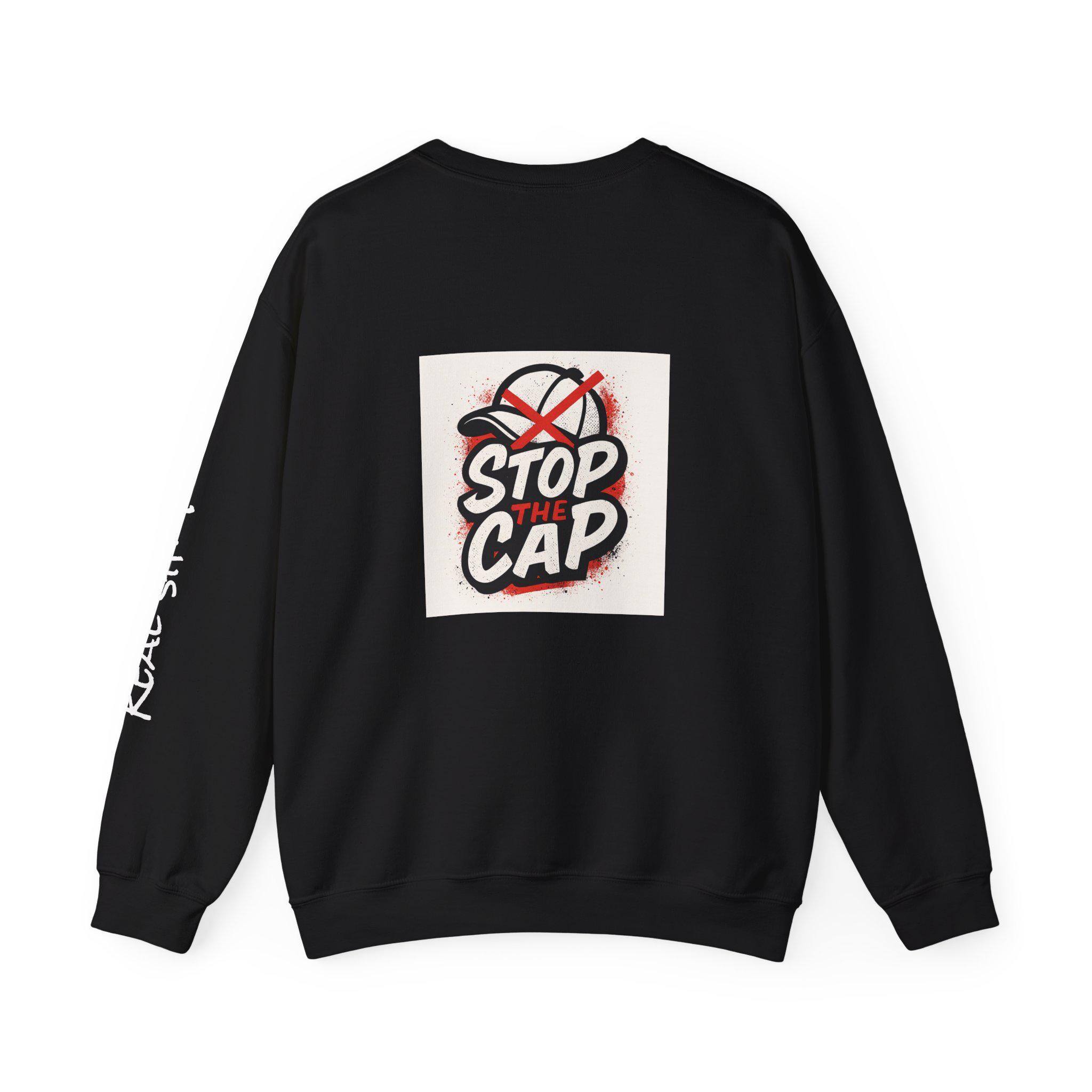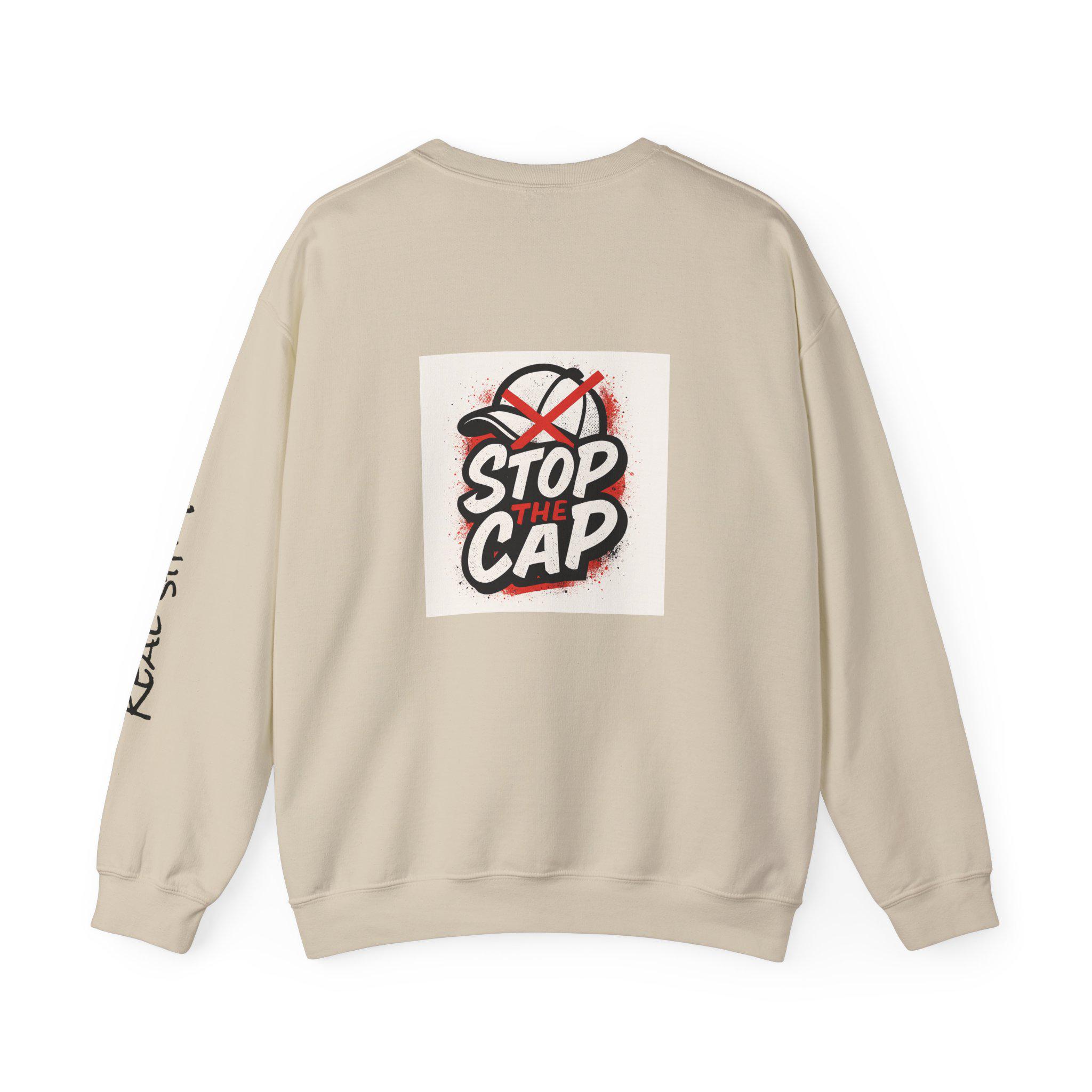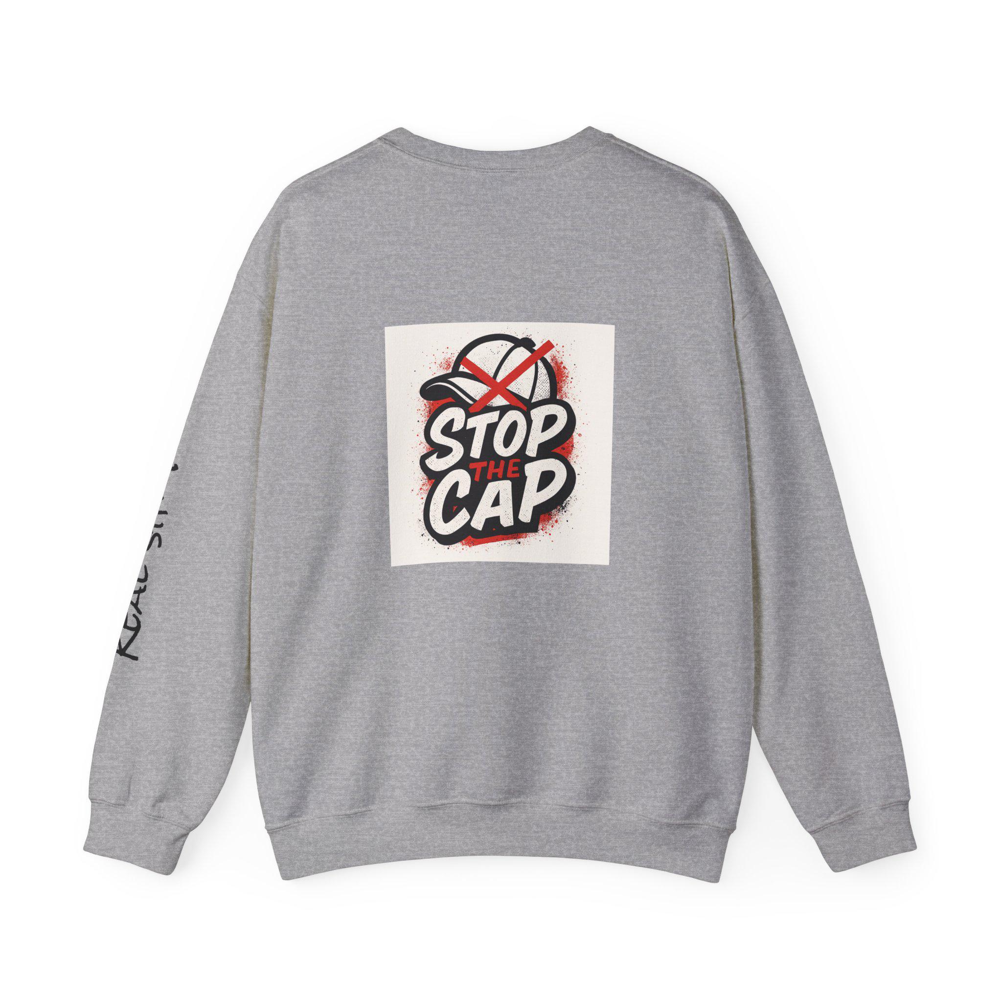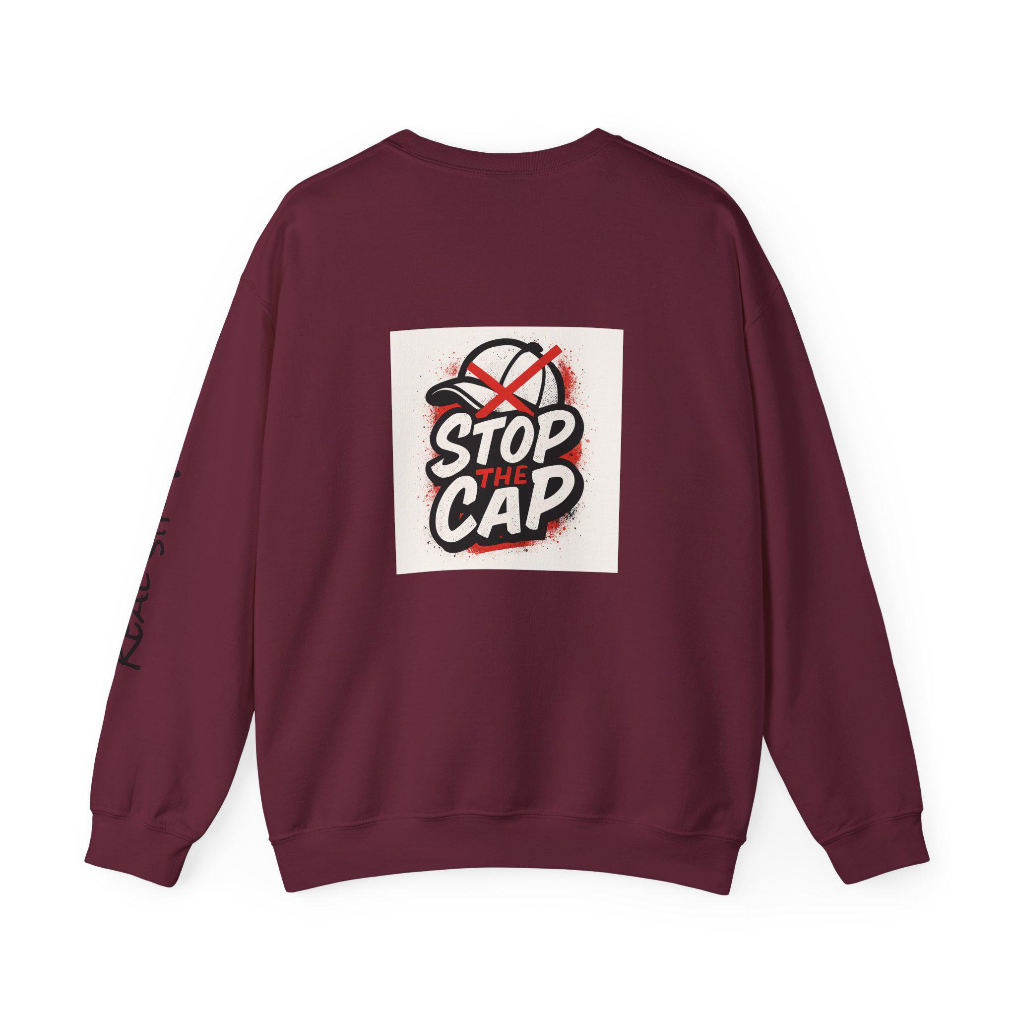 This unisex heavy blend crewneck sweatshirt is perfect for those who value honesty and authenticity. With the message 'Just be real and stop the cap' printed on it, this sweatshirt exudes a genuine and truthful vibe. Ideal for adults looking for comfort and durability in their clothing, this sweatshirt is a great addition to any casual wardrobe. Perfect for holiday gatherings, casual outings, and everyday wear.