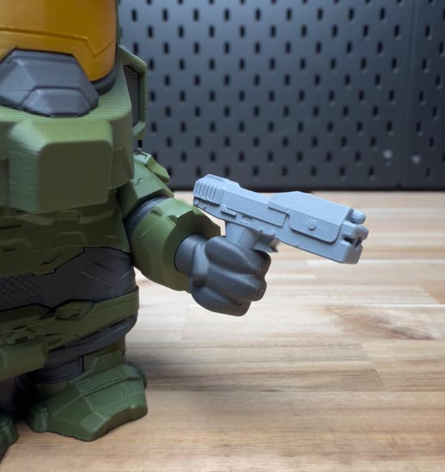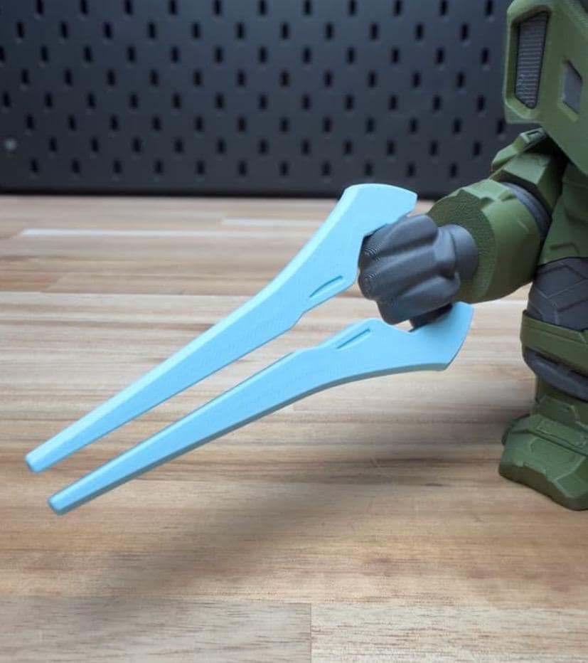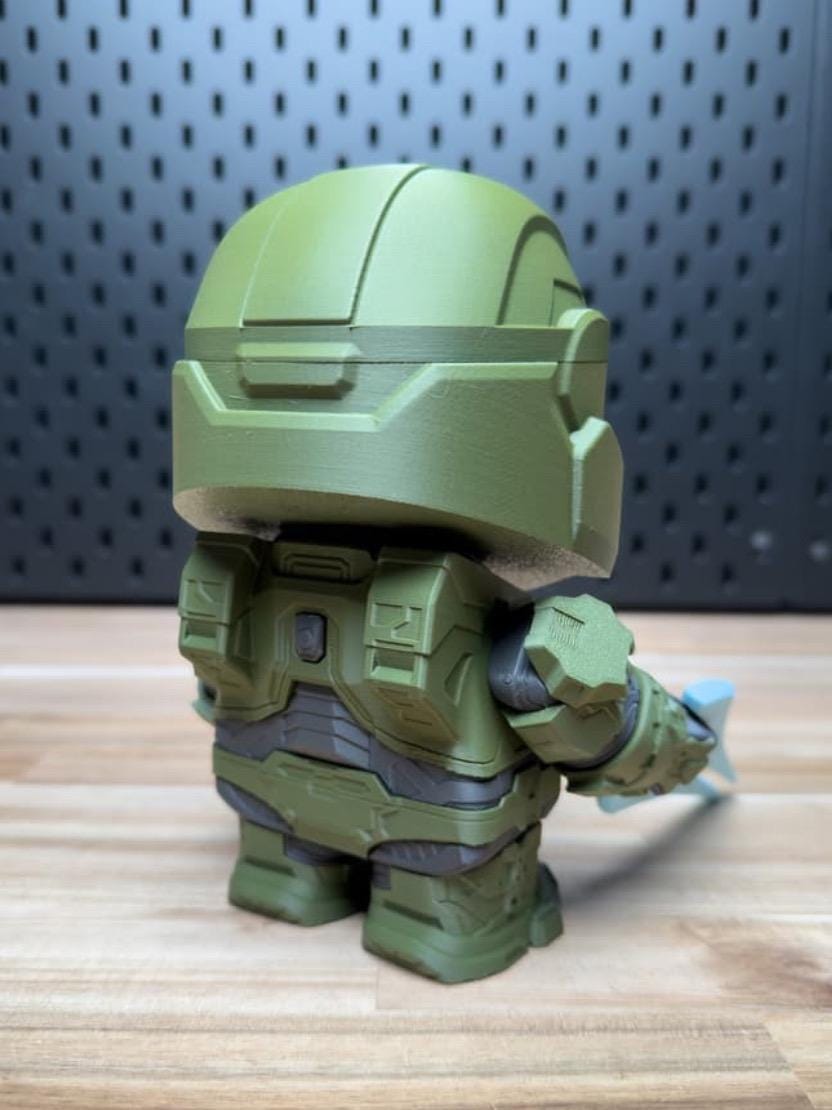 3D printed Master Chief. The head swivels from side to side and the arms/hands move as well, in order to be played with or posed for display. He also comes with his sword and weapon!